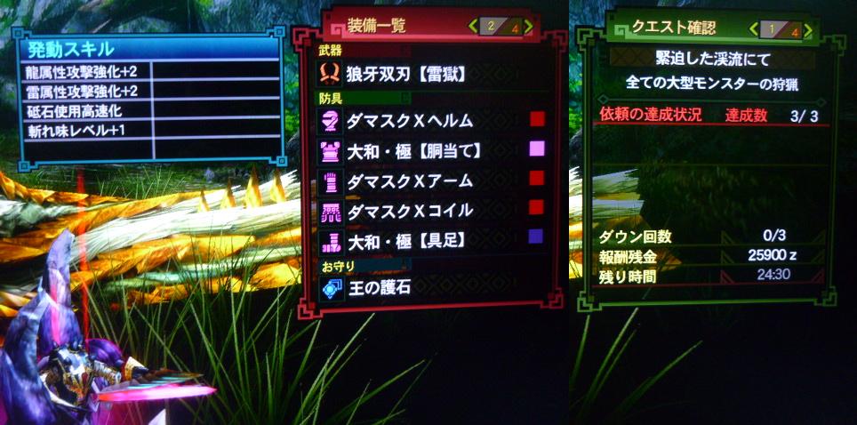 一度挑みに行き28:58と散々で二度目にナルガ、オウガへの対処を考えながら再戦いいタイムな気がする・・!手ぶれがヒドイ画像なのが残念。。