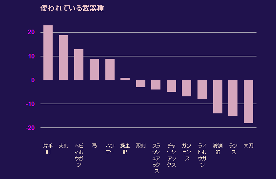 MH4~4Gの人気武器を調べてみた Category:その他 Date:2014年12月18日 一票の格差是正。0増5減が行われた衆議院解散総選挙が行われ 与党が議席数2/3を獲得。憲法改正が現実味を帯びてきました 戦後最低の投票率。強い支持母体を持つ党が低い投票率から議席を増やしました 1票の重み。是正が行われた今回の選挙は奇しくも相対的に1票が重くなる結果に 党首落選。良くも悪くも名を馳せた多くの政治家が政界から姿を消しました でも、そんな事よりももっとずっと気になった事があります やっぱしこのキャラクター、見たことないよ!! 家族もいたんだ、めいすい君(´・ω・`)選挙の公式キャラクターです 子供が3人っぽいけど、コレ選挙権もってるし成人じゃry 前回、行われた参議院選挙の時に思いつきで3Gの所持ギルドカードからモンスターの人気度を調べた事もありましたので今回の解散選挙にちなみ、ちょいと何ぞを調べてみようと考えてみました んでMH4~4Gで良く使われている武器種を調べてみる事にしました 3Gと同じようにモンスターの狩猟数を調べても良かったのですが4からはギルドクエストの需要が高くなったのもあり狩猟数が=人気には繋がらないかな?と考えて武器種に(また気が向けばモンスターの需要度として調べるかもしれません) 算出方法は ・使用回数1位③点、2位②点、3位が①点と計算 (使用回数だけで計算すると1人で数千回使用するハンターに引っ張られちゃう) ・ついでに使われていない武器種も同様に勘定してみた (人気投票は良く見るけど不人気は見ないってな興味本位。むしろそっちメイン) ・使用回数が同じ場合はどんぶり勘定でテケトーに計算 (使用回数0が3つ以上の場合は全て1点で勘定など) 対象のギルドカードは友好度順に30件ほどなもんで普段お世話になるフレンドさんばかりが対象となります 好きな武器や構成で楽しく遊べれば失敗してもいーや!なんて風に遊んでいる方たちばかりなのでガチや効率重視とは違い、純粋に担ぎたい武器が多くなっていると思います ちなみに算出前自身が予想した人気、不人気武器は 人気武器 1:弓 2:大剣 3:片手剣 不人気武器 1:狩猟笛 2:ランス 3:ライト、チャアク でした(・∀・) その結果 グラフ(表示はPC推奨)※グラフが表示されない場合はこちらの画像へ 人気 不人気1:大剣 30 112:片手剣 28 53:ヘビィ 19 63:弓 19 105:ハンマー 16 76:操虫棍 13 127:ガンス 12 198:スラアク 10 149:ランス 8 2310:チャアク 7 1211:双剣 6 912:ライト 6 1413:狩猟笛 6 2014:太刀 4 22 人気は予想通りかしら?ただ不人気1位がランスって・・(;´Д`)もはや希少種・・ ◇雑感◇ 使いやすく発掘の倍率やモーション値でのブースト4からの隙潰しにも対応しやすい大剣の1位は納得。2位片手剣も対処のし易さで同様に 4では発掘の性能がぶっ飛んでいた弓はヘビィと並び3位にフレンドさん調べなのもあり弓を1位と予想していたけど段差や傾斜の影響からか票はあまり伸びず。シャガル部屋のギルカだと1位だたかも 5位のハンマーは大健闘じゃないかしら。4の使用回数で救われた感も。。6位の操虫棍は新武器にしては受け入れられている感じ。単純に強いしなぁ 7位のガンランスは拡散lv5の強さが票の後押しをした感じ。一変、4Gでは希少種に。。8位にまさかのランクイン、スラアク!好きな人はトコトン好きな武器。いいね! 9位にランス。自身で3点入っているのを抜けば人気順でも最下位争い。回避3は別物!10位のチャアク、4では一癖あったけれど4Gで使いやすくなりGで票が伸びる筆頭? 11位の双剣は意外と低い印象。属性よりも物理が有効な敵ばかりだしなぁ。。12位ライトは裸のオトモ。14武器種の中で最も構成を楽しめる武器種だと思います 13位にぴーひゃらら。演奏するのも命がけ、重ねがけはBCへの鎮魂歌。。14位、最下位は太刀。んー・・太刀はよーわからん(・∀・;;) と、ここまでは人気ランキングですが使われている武器を調べるのなら、人気点から不人気点を引いたらどうだろう? そんな風に算出したグラフもついでに載っけてみます こちらの画像へ 1:片手剣 23 ↑12:大剣 19 ↓13:ヘビィ 134:弓 95:ハンマー 96:操虫棍 17:双剣 -3 ↑48:スラアク -4 9:チャアク -5 ↑110:ガンス -7 ↓311:ライト -8 ↑112:狩猟笛 -14 ↑113:ランス -15 ↓414:太刀 -18 おお、思っていたより順位に動きがある(゜∀゜)!? 双剣の上がり、ガンスランスの下がりを見ると使いやすい武器と使うにはスキルと慣れが必要な武器種で違いが出るのかもしれません ガード性能ありきの武器は仕方がないけれども・・どんだけランス希少種なんだ・・むしろ太刀さん、なんだかありがとう(´;ω;`)転ばせてくれてもいいでランす。。 また人気武器でネットサーフィンをしていたらちょいと面白いアンケートが見つかりました 出典はマイナビニュース男女別に好きな武器のアンケートを募った内容となっています アンケートの開催が2012年7月4日~7月16日なのでMH3Gが発売されてから半年が過ぎたあたりのアンケートになっています 好きな武器 男性 好きな武器 女性 【男性】 