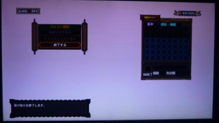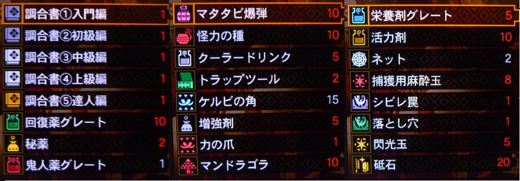回復薬G2 古の秘薬1 閃光玉2 捕獲玉6 落とし穴1マタタビ爆弾2 砥石5 マンドラゴラ2 ケルビの角3