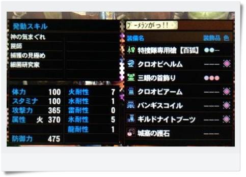攻撃はブーメランのみ!でティガレックス希少種と遊んできた Category:MH4 Date:2014年08月10日 えい えい おー 週末ヒーロー、ブーメランハンターZ! 広島カープの応援スタイルっぽい? ふぅ↑ ふぅ↑ やっぱり縛りがナンバーワン! やっぱり裸がナンバーワン! B!U!M!E! ブーメ!(ラン!) このハイパーユニオンの応援を聞いた時はなんて前衛的、アバンギャルドな応援なんだろうと思いました興味があればwebで探してみて下さい(・ω・) なんのこっちゃですが 【ブーメランのみでティガテックス希少種を倒してみよう!】 で遊んでみました 村ドスジャギィさんで威力を試し上位ドスジャギィさんで神の気まぐれの大切を知りこの世で一つだけの限定モデル、3DSV(初期フレアレッドver)カッチョイイ!とかなんとかチャットしながら行ってきました その結果2分でこの有り様(´・ω・`) 安定の不安定!開始2分で回線が落ち一人ガックリと肩を落とし膝をつく、見慣れた光景(ノД`) こういう時に決まって、今までのようにチャットが繋がっていれば・・と強く感じてしまいます。。クエ中のチャット然り、あって当然なのに。。 でも、求めてもナイもんはナイ! エライ人は言いました。求めるな、与えよと! お約束のように1人落ち、残る3人でブーメランを投げまくるハンターの成功を祈りながらこの待ち時間に最善を尽くせる事とは?と考え、装備の見直しに! んで簡単に組んだのがコレブーメランがっ!!この縛りでの最重要スキル、神の気まぐれをベースに罠師、捕獲の見極めで状況のサポート&細菌研究家で爆破やられ対策! 大層に言ってますが、胴系統倍加しただけです(゜∀゜) しばらくして(20分弱?)ブーメランハンターが凱旋! その時の様子 「回復尽きた・・」 「後半キックのみしんどい・・」 「でも尻尾切ったでよ!」 「こっそり剥ぎ取った!」 ・・失敗してきたのね(;^ω^) て、手応えは?と聞くと 「逝けそう!」 とのお応え!!おっしゃ!ならば逝ける、いや逝く! 二度目となりブーメランのみの動き、対策などを講じながら 「神の気まぐれつける・・」 「装備見直してくるー」 「息子起きてきた」 「メンマ」 と言ったナゾの会話で士気を高め、リベンジ! その結果ティガレックス希少種、とったどぉお!! 破天大轟 ブーメランのみ!23:30 討伐 8/9 聞き分けのない ティガの鼻を ひとつ ふたつ (くの字鼻栓で)詰めてやった! 尻尾も10分ぐらいで切ってやった(`・ω・´)爆心ダセー 腕の破壊を確認し、頭破壊も狙ってみたけどちょい足りず 捕獲の見極めは20分程で確認、そこでポーチも確認するとブーメラン砥石合わせて残り12はある、なんと楽勝じゃないか! 結果、4人のブーメラン残り数は平均9個ほどとなり持ち込み+調合分が25なので4人の平均使用数は16ほど、2/3ぐらいで済みました( ・∀・) ・・あれ、ソロでも時間を度外視すれば持ち込みでなんとか討伐出来るかも?と思っていただけに、意外と使ったかもしれない(。´д`。)? ダメージ量は問題ないみたいだから壊れる確率が思っていたより高いのかなぁ。。 ・・ま、いいや! 砥石拾えたらいいんだし、拾えないのならマグロ食えばいいんだ(`ω ´ *) 楽しかったのもあり、クリア後には次の目標談義に花が咲き体力低めの~、尻尾切りたし(ココ大事)、ブラキでいいんでね?と、なんとなーくブーメランのみ!でブラキLv100が決定!? 誰よりも早く、サジを投げてやる!( ノ  ̄皿 ̄)ノ あいや、ブーメラン投げてやんよ!! PR