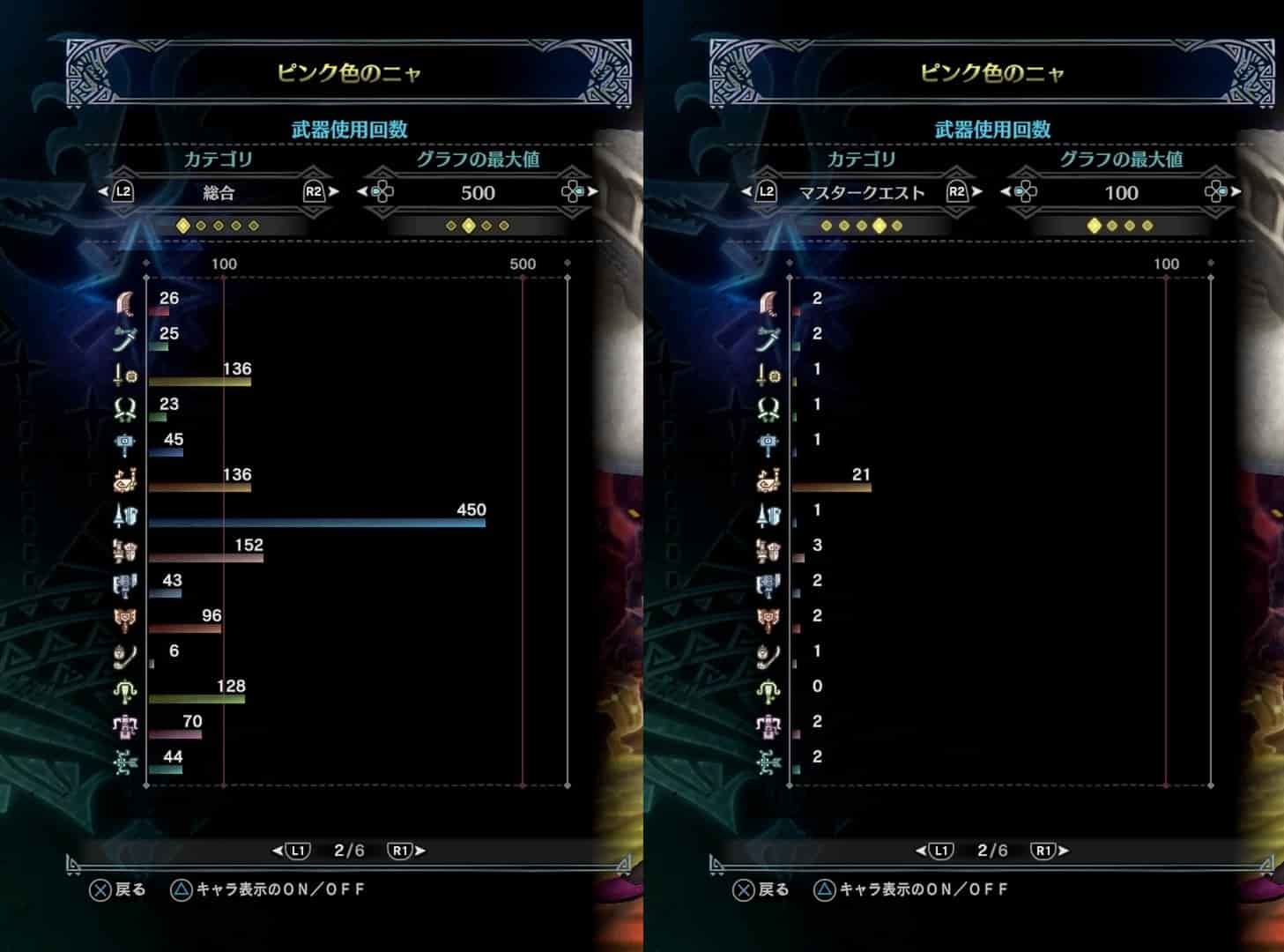 笛の使用回数が抜けて多いのは採取、小型クエスト等で使うのと、